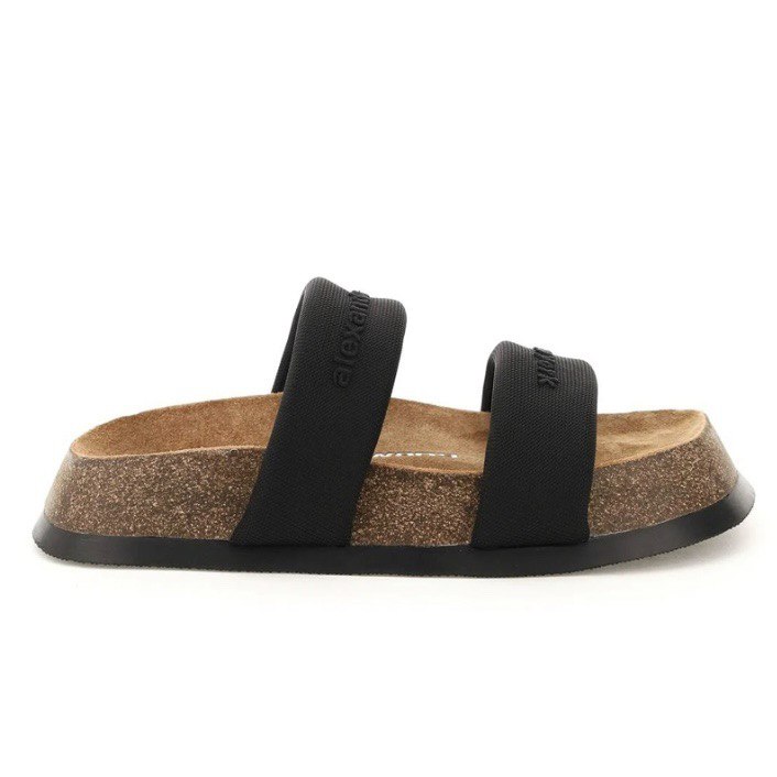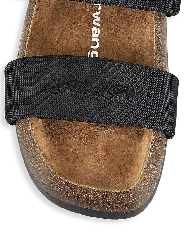Black Ronan sandals from Alexander Wang brand. Features cotton jersey and suede in black. with open square toe.