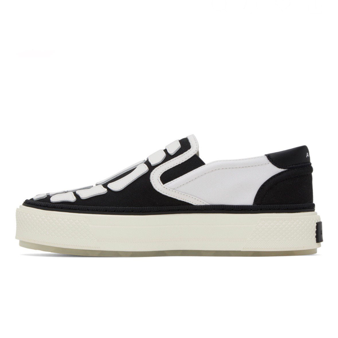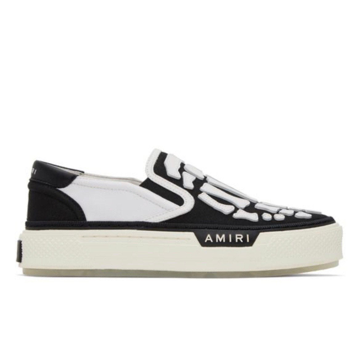 Slip-on sneakers from Amiri brand. Features closed round toe, panelled construction, branding on outsole, hand-cut and edge-painted leather bones appliqué,