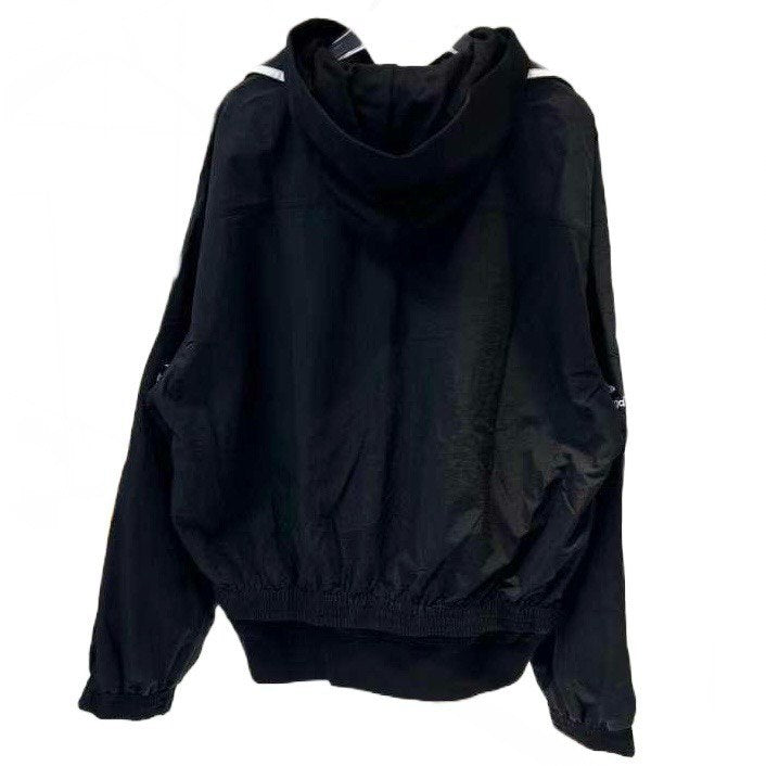 This lightweight jacket by Balenciaga features a 3B sports icon print on black nylon, with a cotton hood, double zip front fastening, and slanted zipped side pockets. The elasticated cuffs and hem provide a comfortable fit, while the oversized design adds a trendy touch.