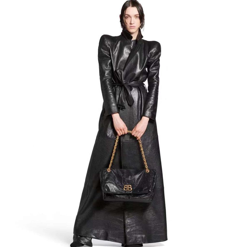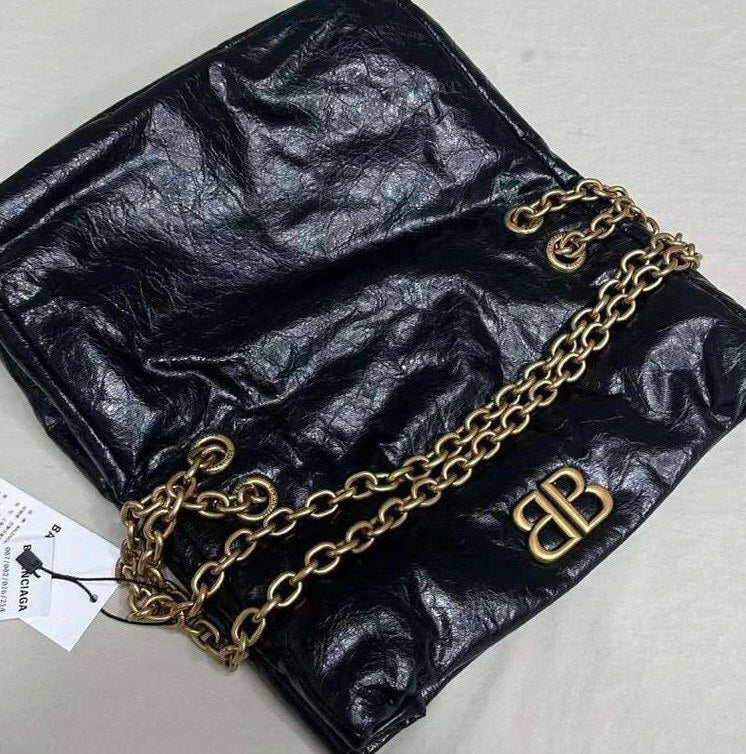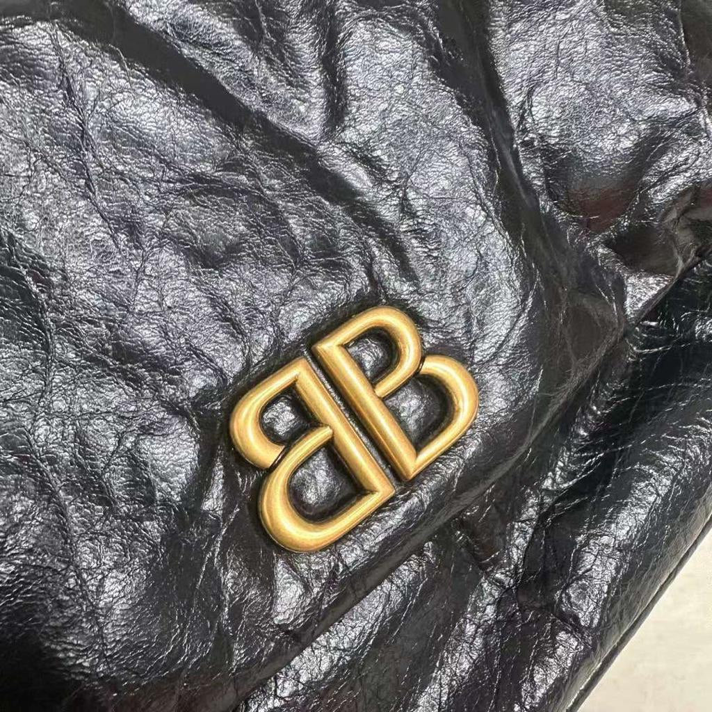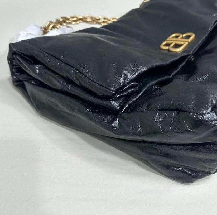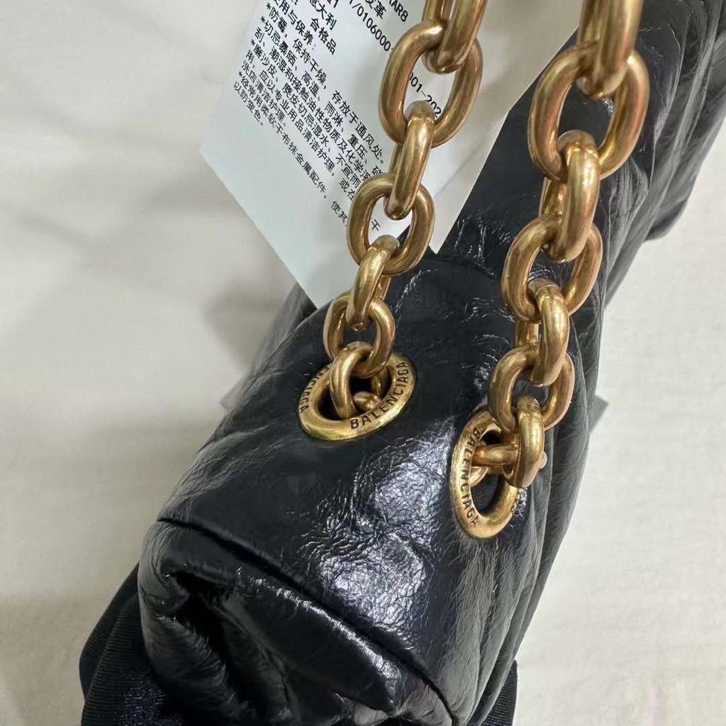 Introducing the BALENCIAGA Monaco Medium Black Leather Shoulder Bag. This bold yet minimalistic bag is equipped with a gold-tone logo plaque and a stylish crinkled finish. The chain-strap design not only adds a touch of elegance but also provides comfortable wear. Upgrade your look with this sophisticated shoulder bag.
