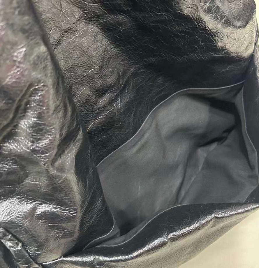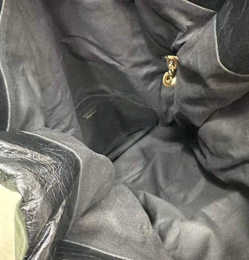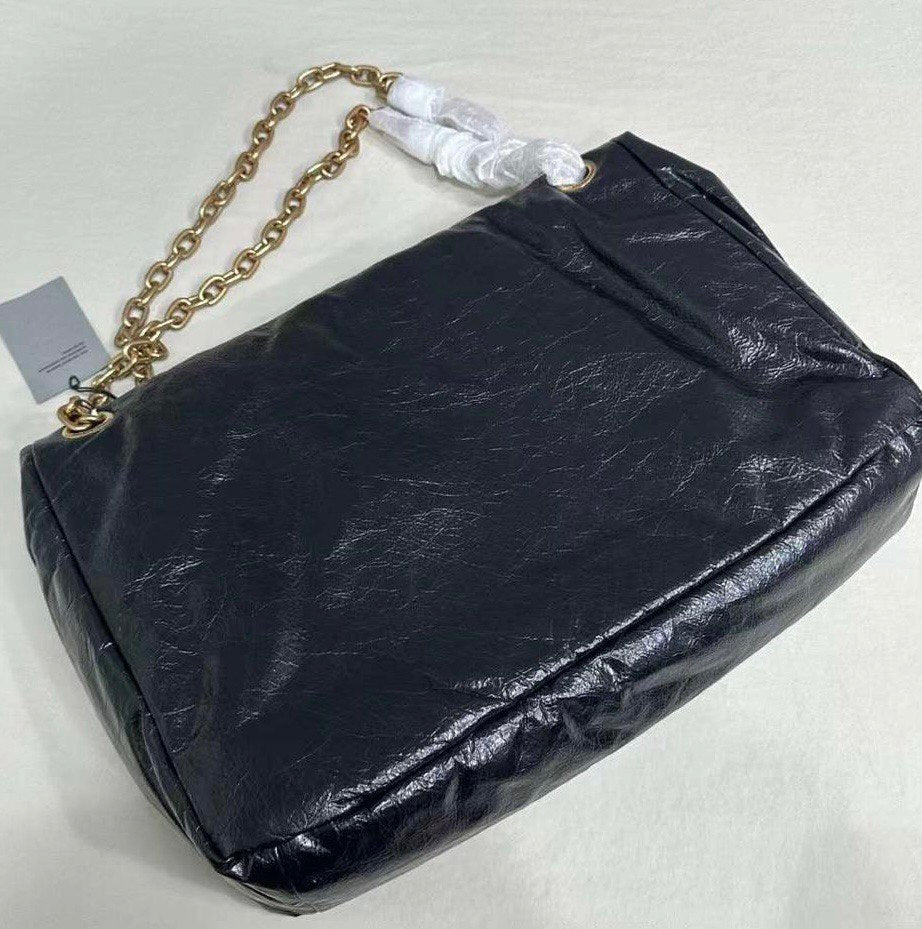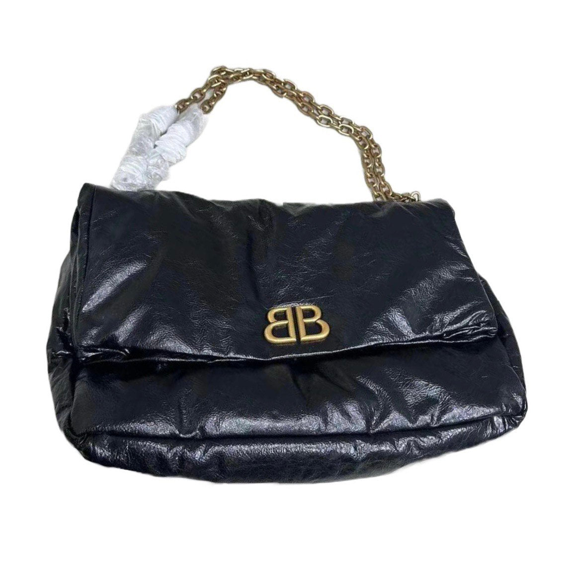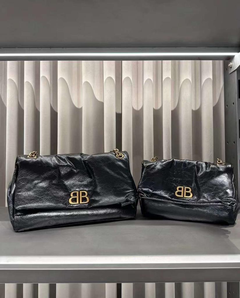 Introducing the BALENCIAGA Monaco Medium Black Leather Shoulder Bag. This bold yet minimalistic bag is equipped with a gold-tone logo plaque and a stylish crinkled finish. The chain-strap design not only adds a touch of elegance but also provides comfortable wear. Upgrade your look with this sophisticated shoulder bag.