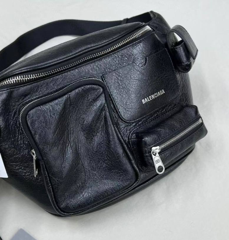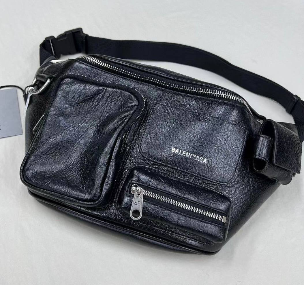 Super Busy branded fanny pack from Balenciaga brand featuring black, lambskin, logo print to the front, top zip fastening, adjustable waist strap, front zip-fastening pocket, rear zip-fastening pocket and cotton lining.