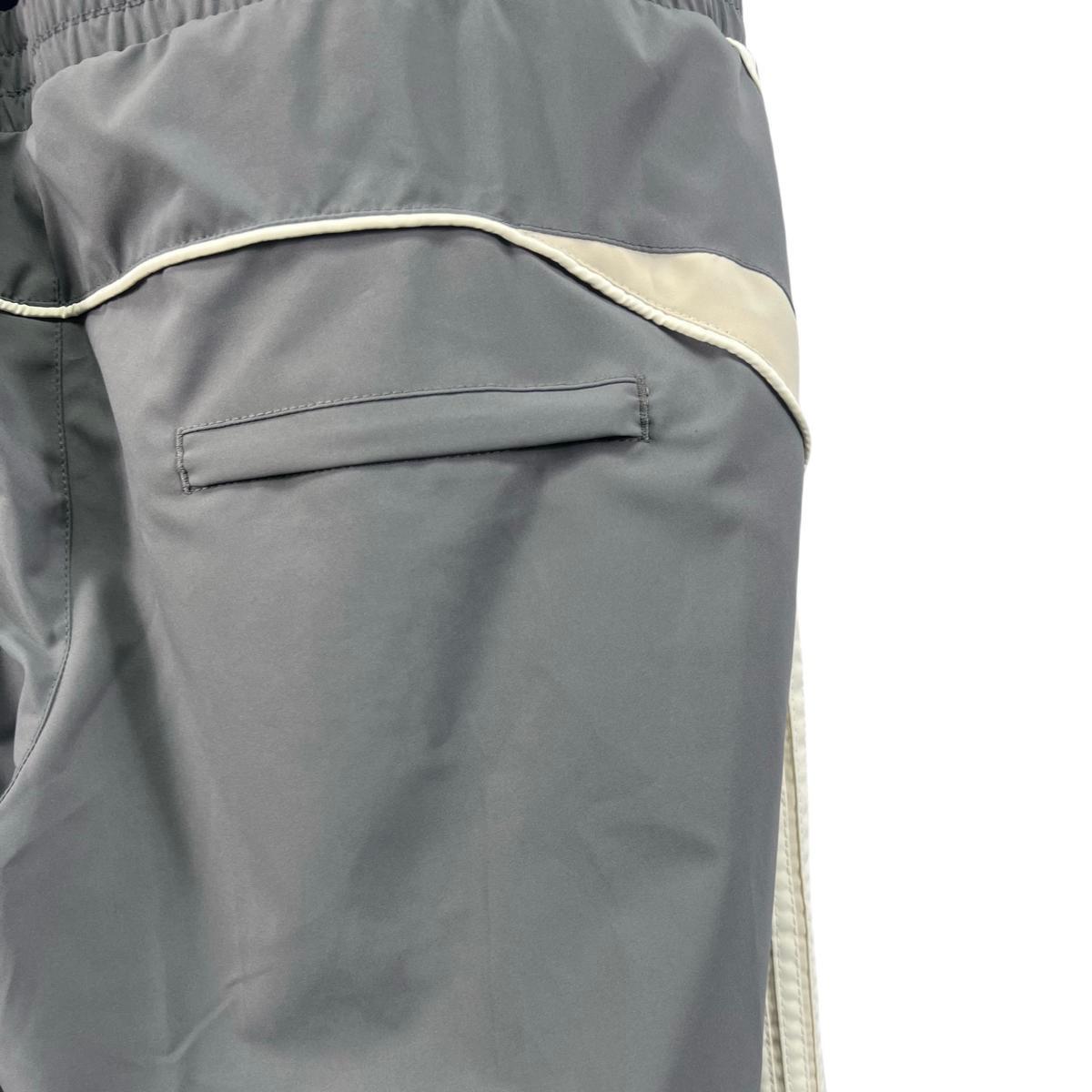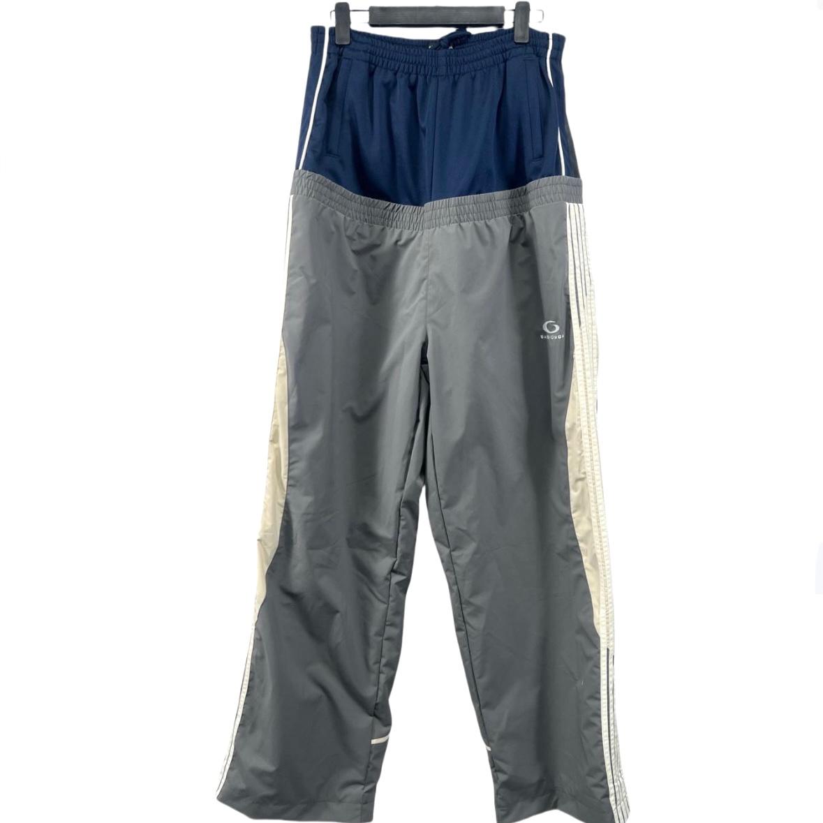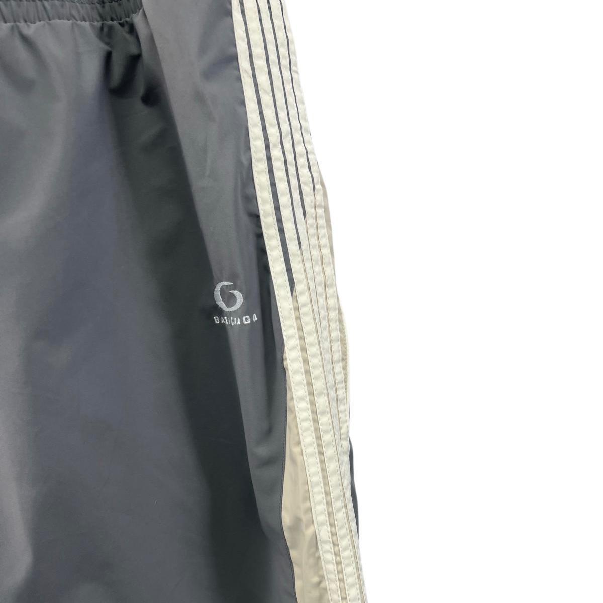 Balenciaga Tracksuit Cut-Up Trousers. Grey technical stretch fabric. Trompe l'oeil effect double waistband. Two zipped side pockets, one zipped back pocket. Embroidered sports icon loop motif. Contrasting details.