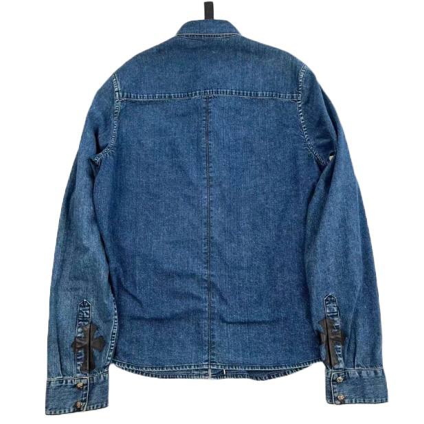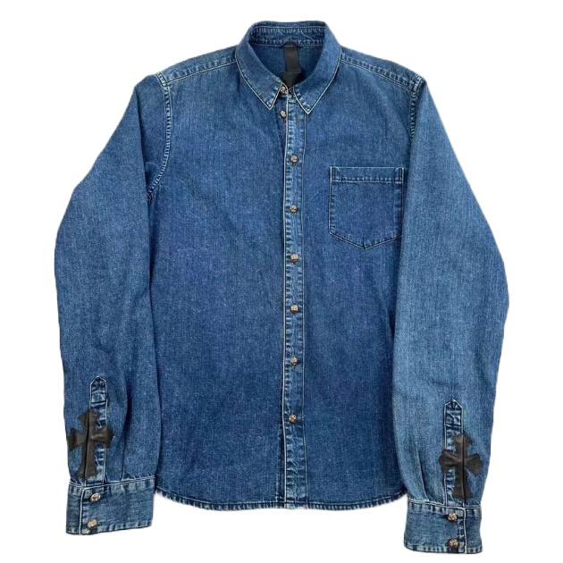 Blue Denim Shirt from Chrome hearts brand, with black leather cross parches on the sleeves