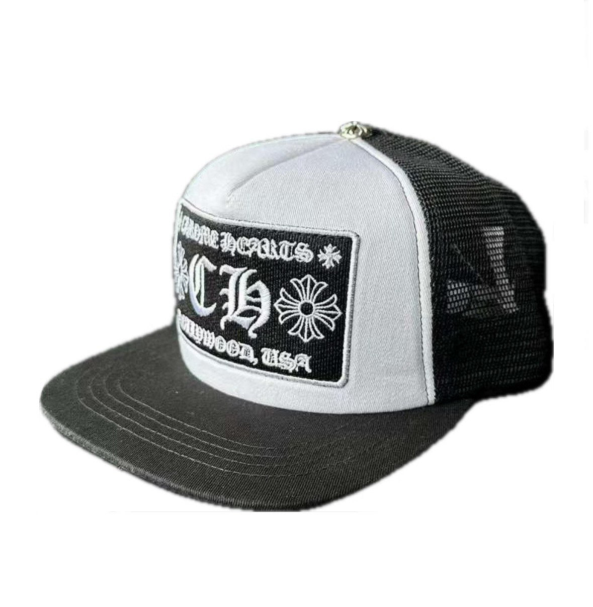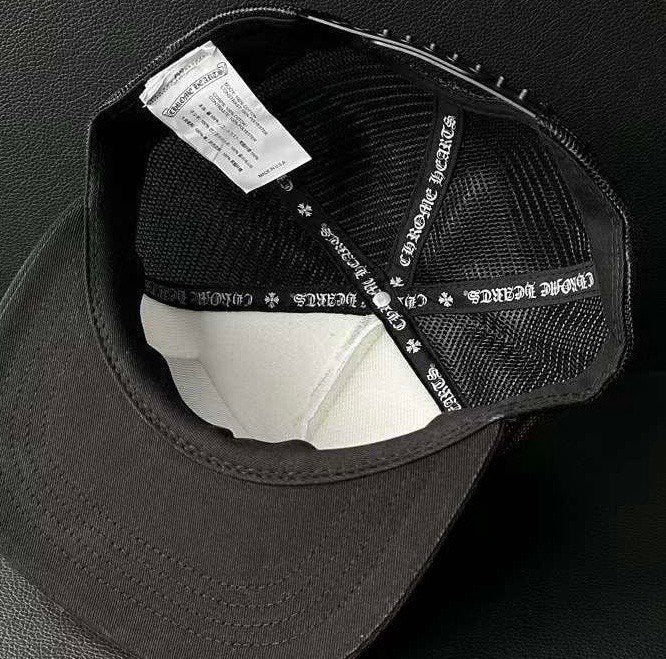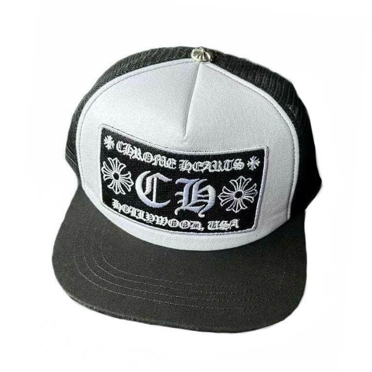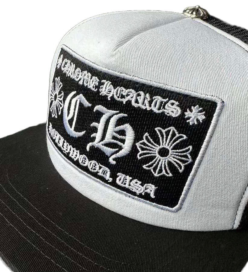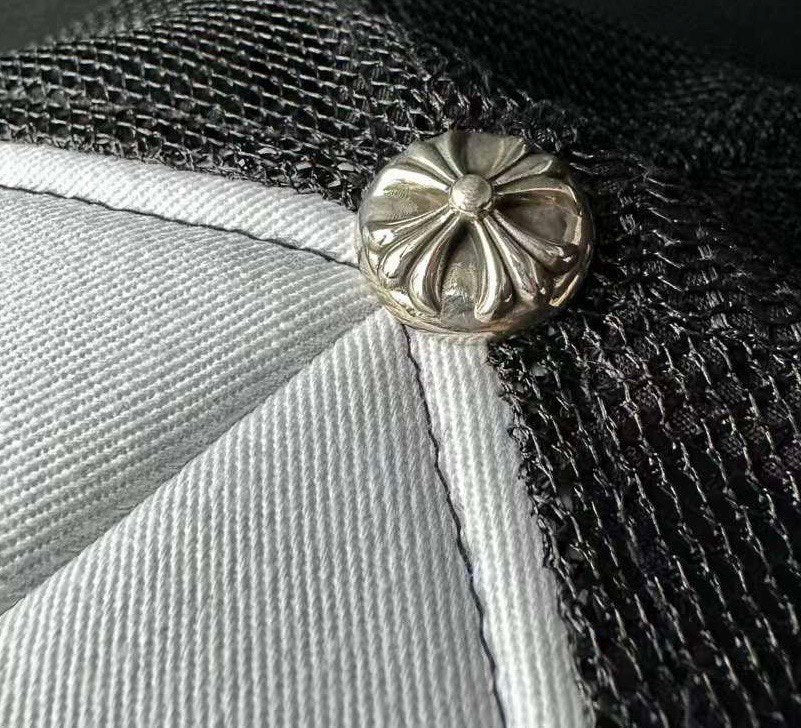 This CHROME HEARTS Hollywood Trucker Hat boasts a sleek white design with a bold sterling silver button on top. Get ready to elevate your streetwear style with this statement piece. Made with premium materials, it offers both fashion and functionality for any outfit.