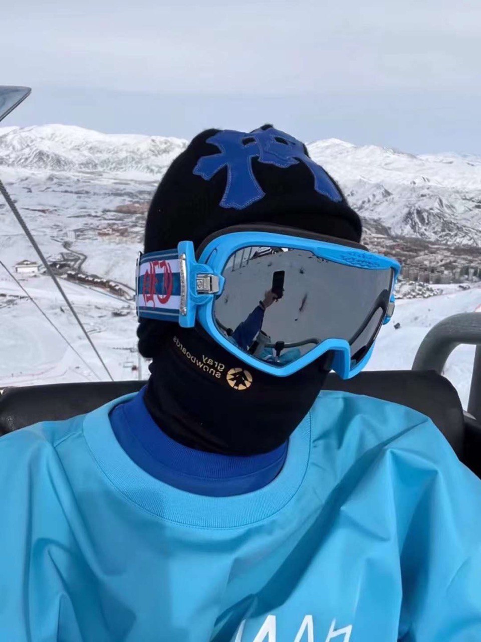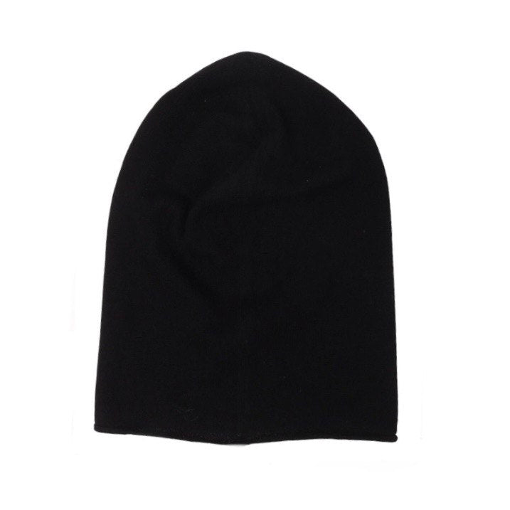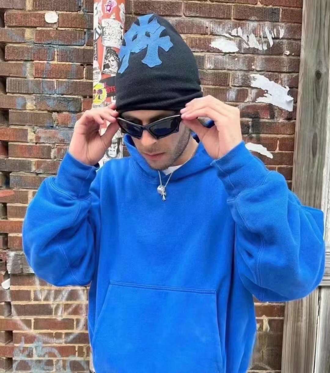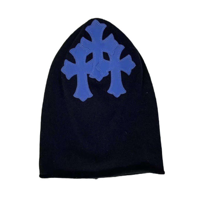 Cashmere Beanie from Chrome Hearts brand, in black color with blue leather cross patches on the top