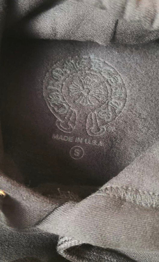 Exclusive black hoodie from Chrome Hearts brand, with graphic print in purple and white colors on the back