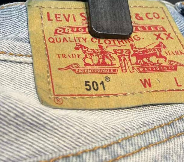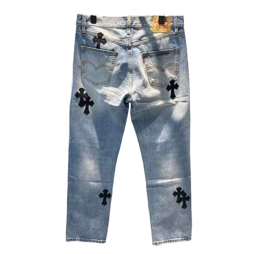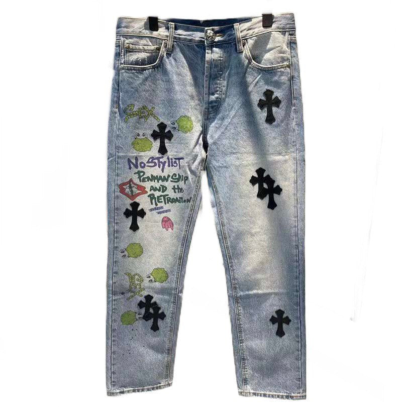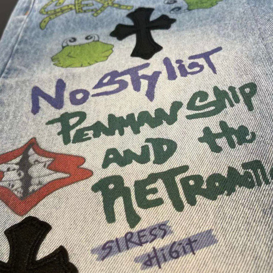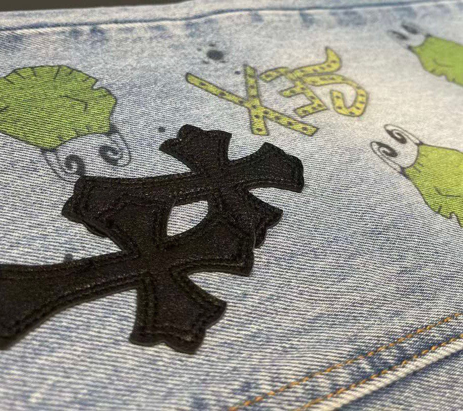 Blue Chrome Hearts and Matty Boy collaboration denim jeans with black leather cross patches, and colored text print