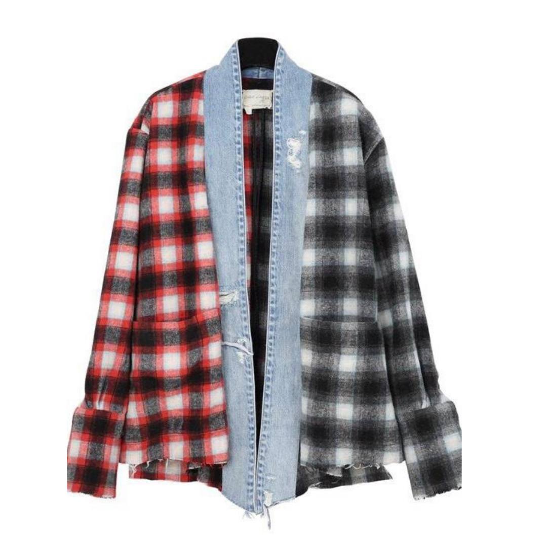 An unique and classic jacket made by Greg Lauren. A combination makes the jacket of cotton and wool. The majority portion of the jacket is in black and red, but it is still considered to be a multi-colored jacket. The middle part of the jacket is in classic jeans color with a ripped off jeans texture as well.