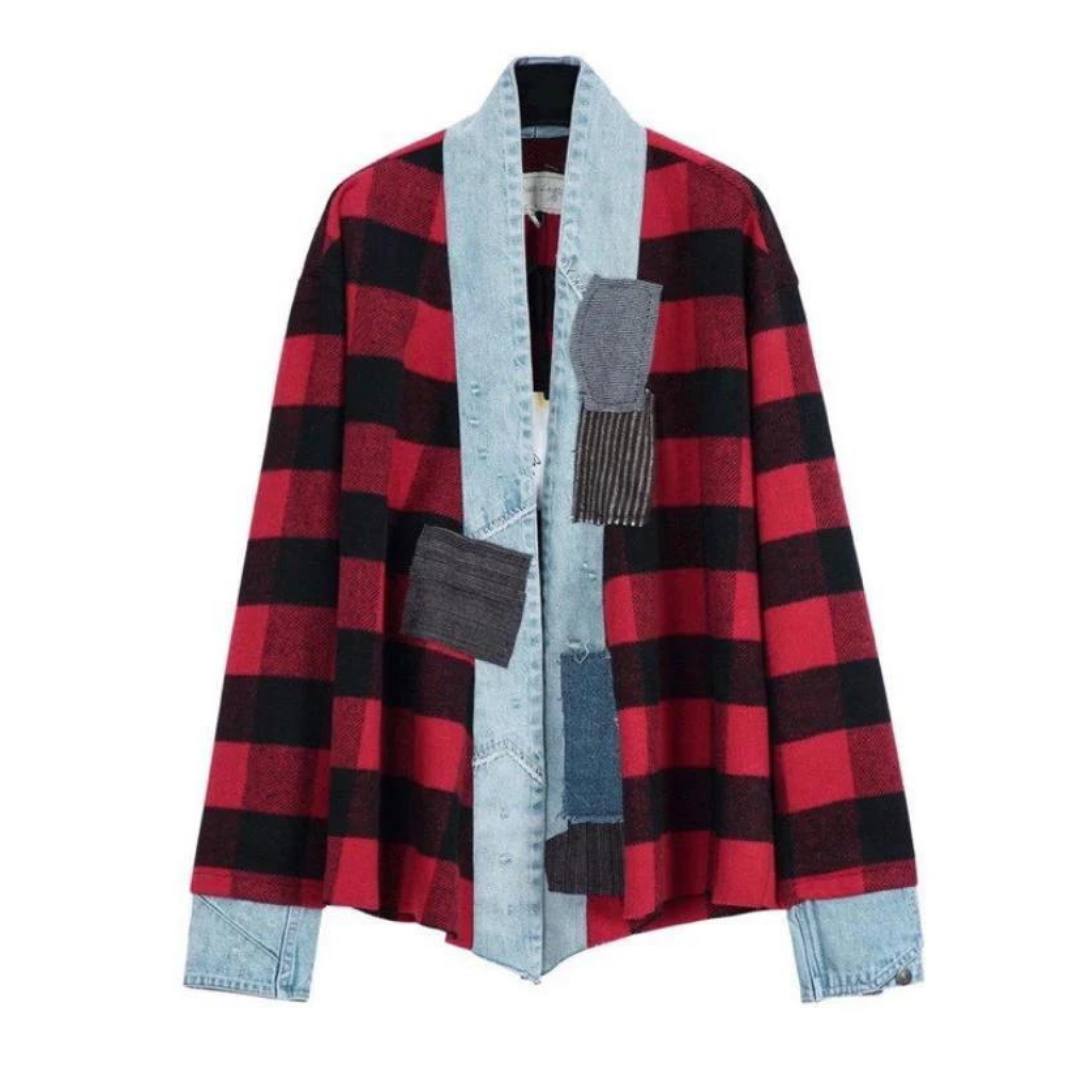 An unique and classic jacket made by Greg Lauren. A combination makes the jacket of cotton and wool. The majority portion of the jacket is in red, but it is still considered to be a multi-colored jacket. The middle part of the jacket is in classic jeans color with a ripped off jeans texture as well.