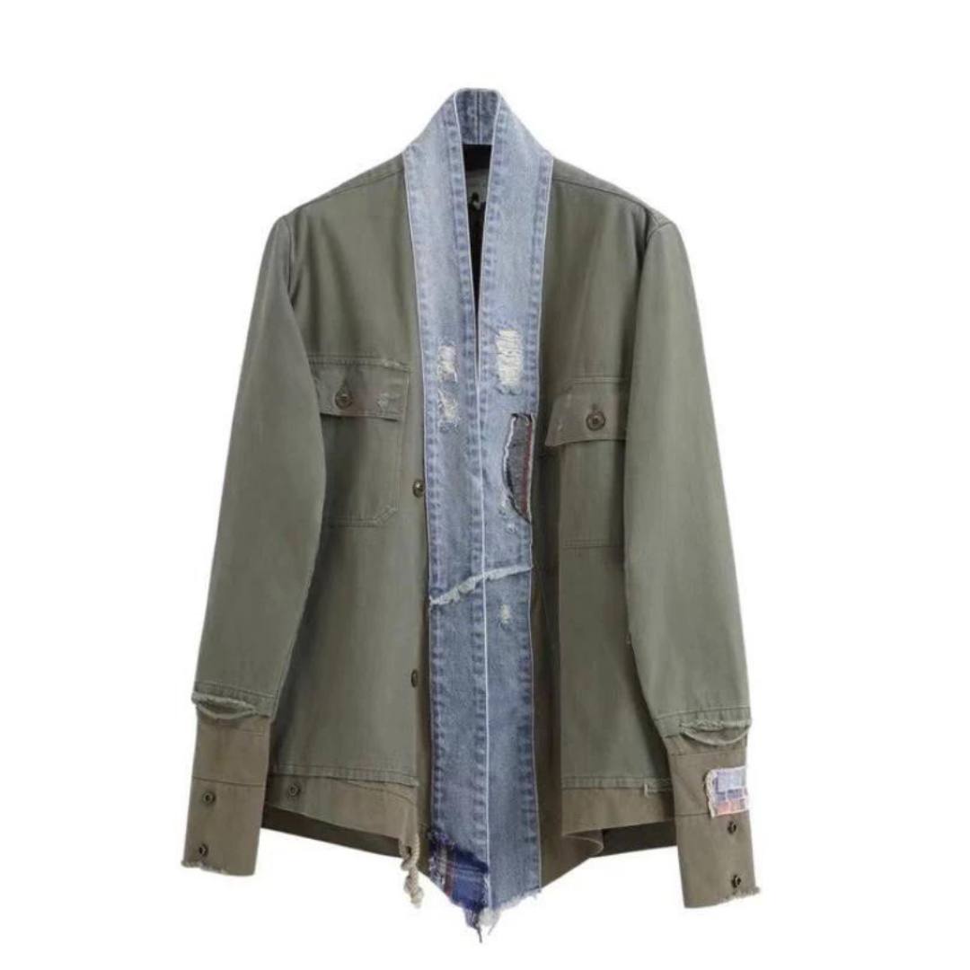 An unique and classic jacket made by Greg Lauren. A combination makes the jacket of cotton and wool. The majority portion of the jacket is in khaki.