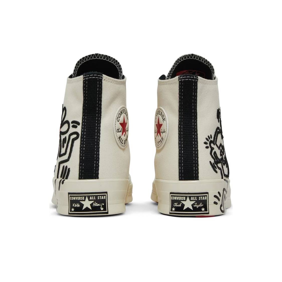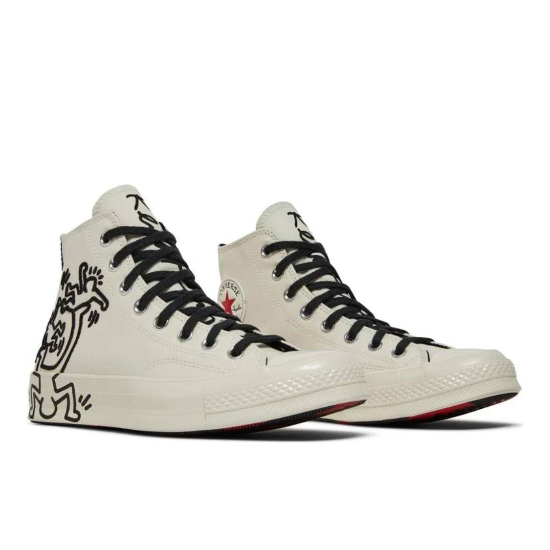 Sneakers are built with organic canvas, the shoe's upper appears in white, highlighted by Keith Haring's dancing figures in a black embroidered fashion on the lateral side, continuing down onto the midsole.