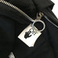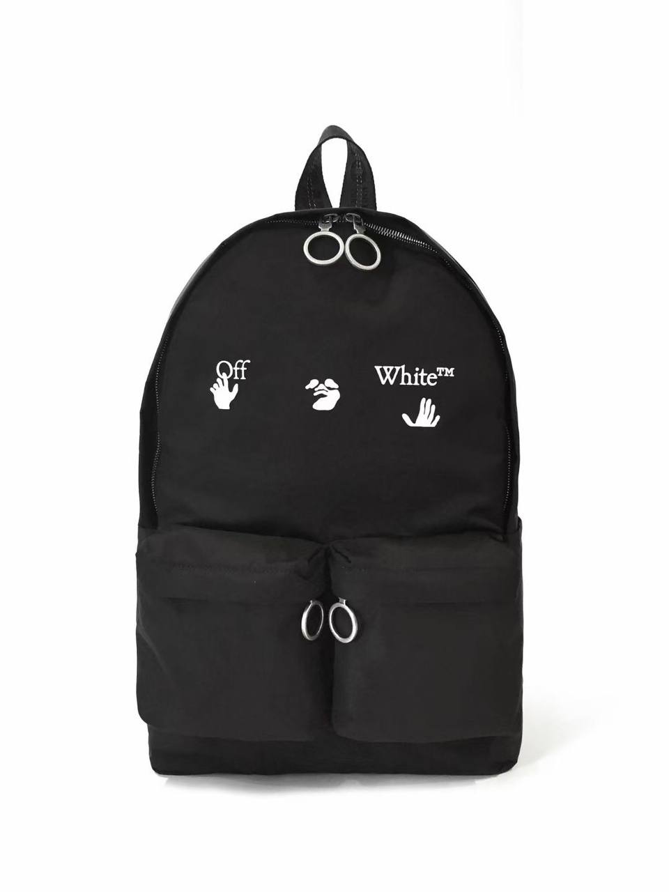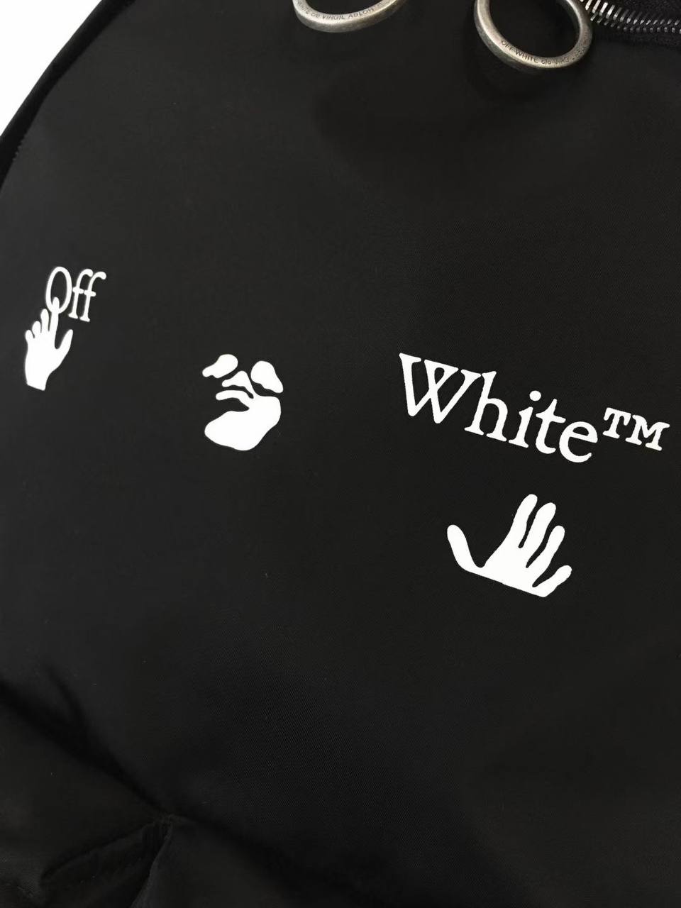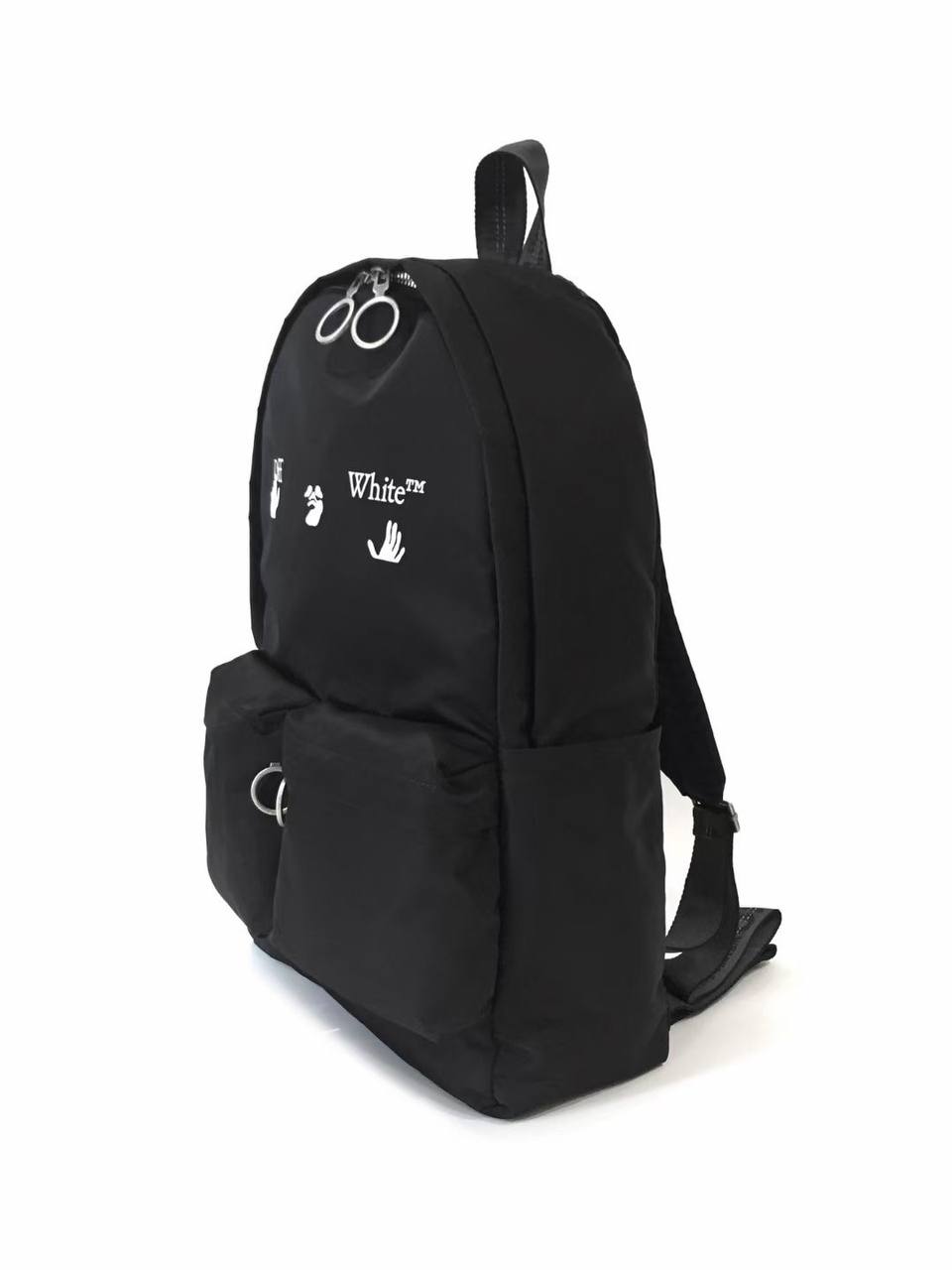 The streetwear all-black iteration label's Hands OFF motifs in a contrasting white hue and Industrial shoulder straps.