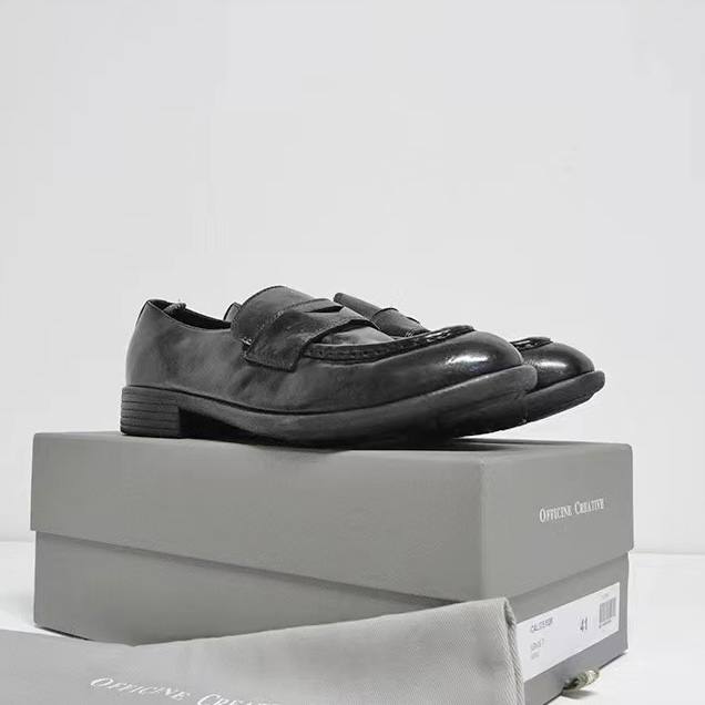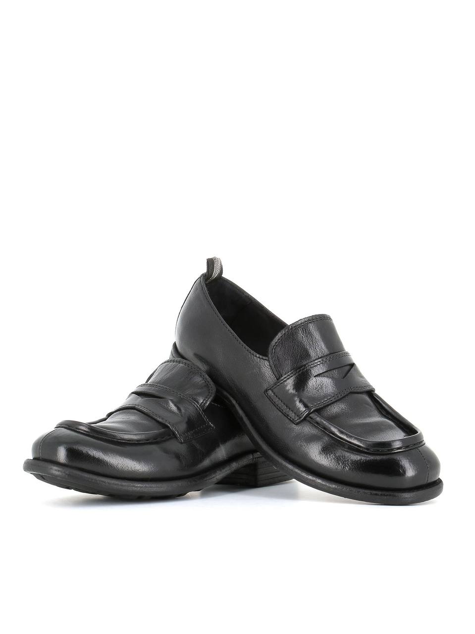 Black buffalo leather and calf leather Arc loafers from Officine Creative featuring a round toe, a branded insole, a pull tab at the rear and a chunky low heel.