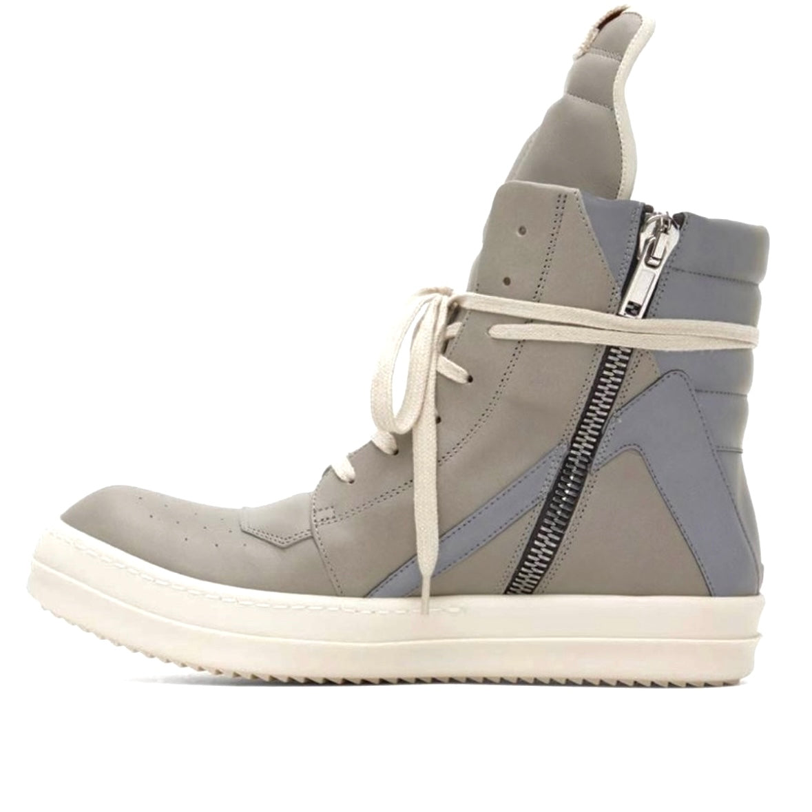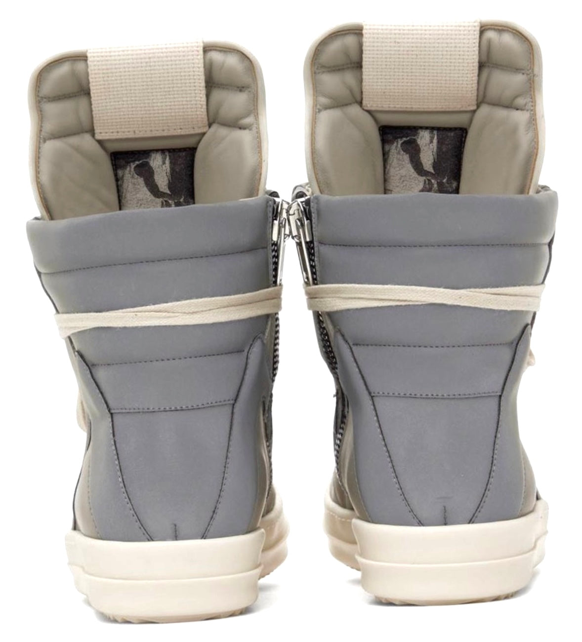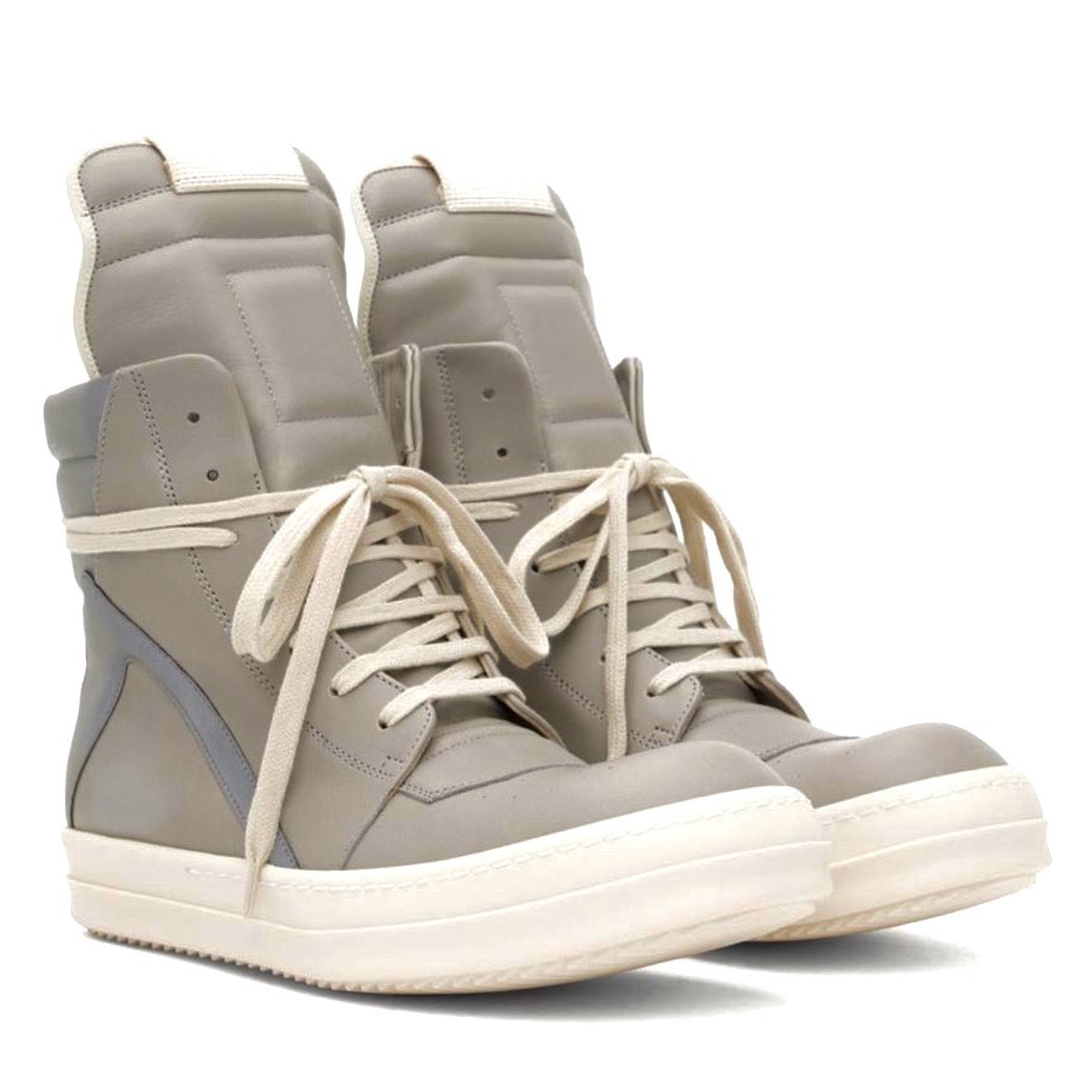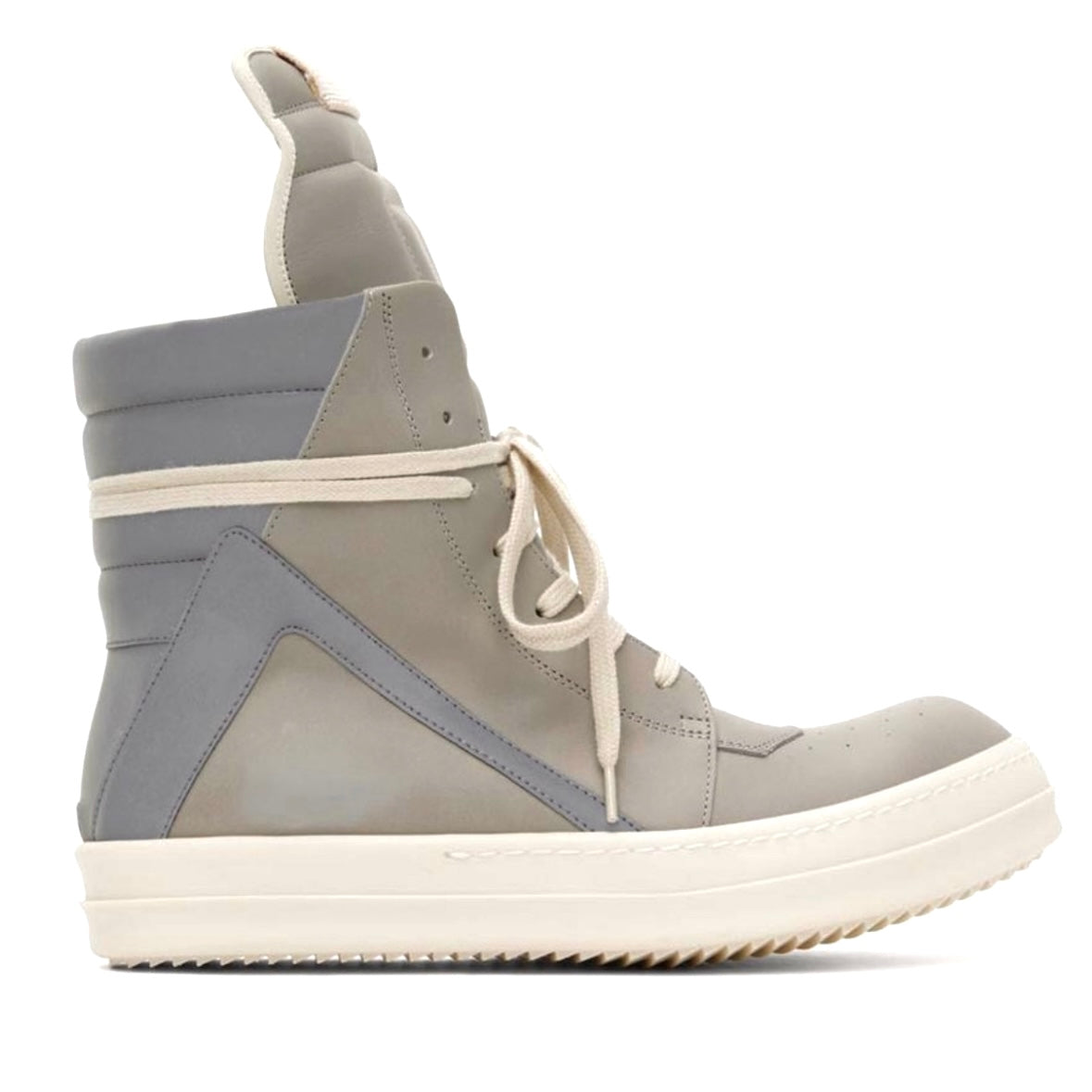 High-top sneakers in gray buffed calfskin with perforated detailing, reflective accents, and a chunky platform sole. Lace-up closure with side zip.