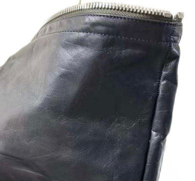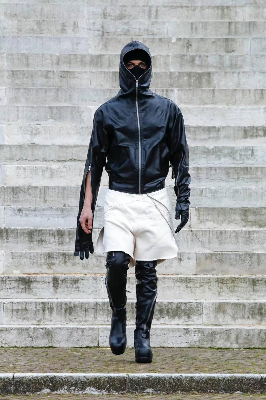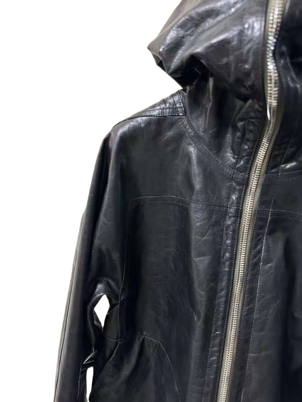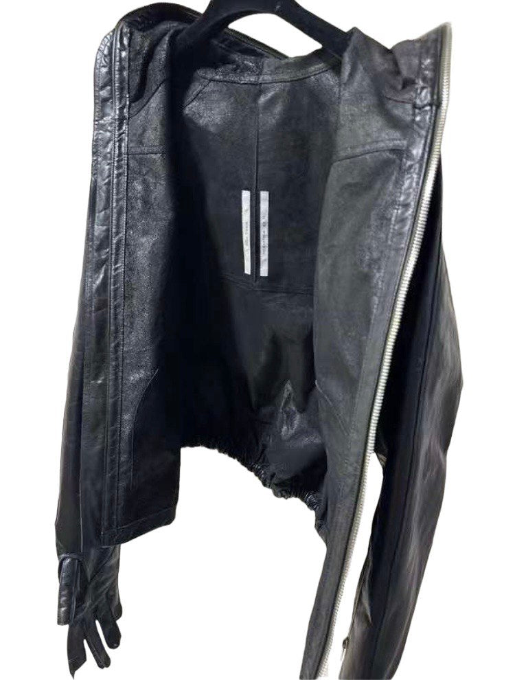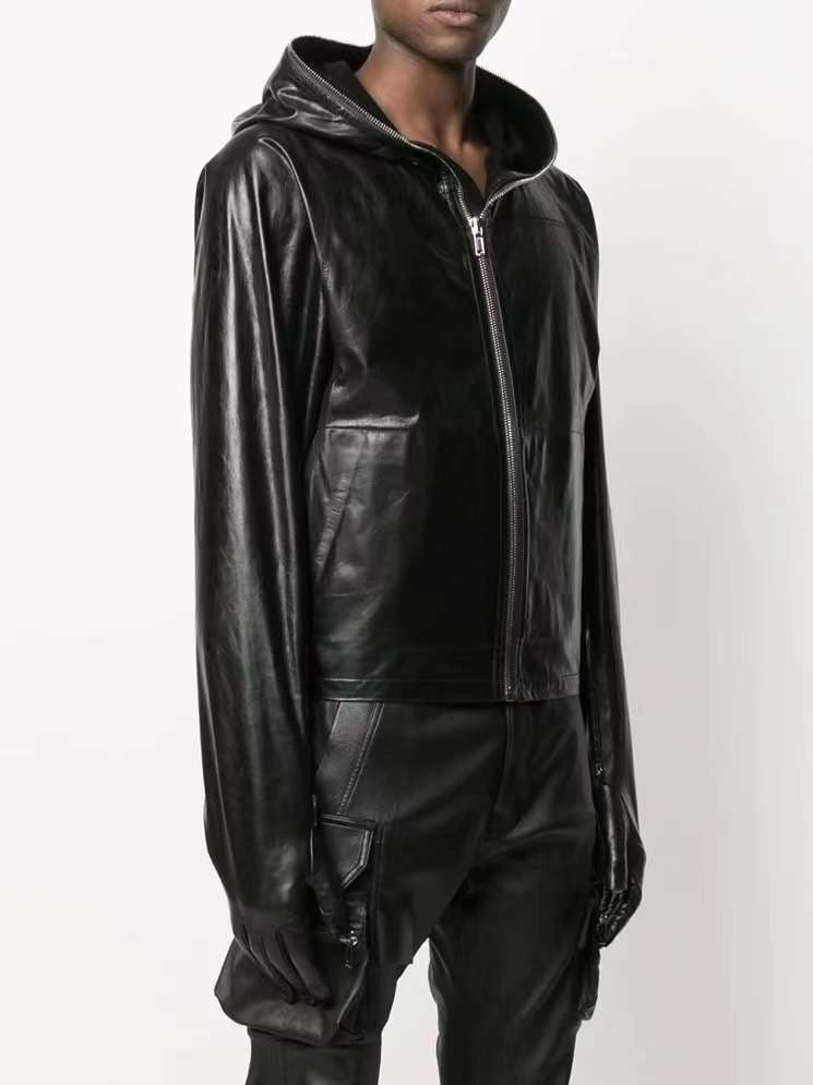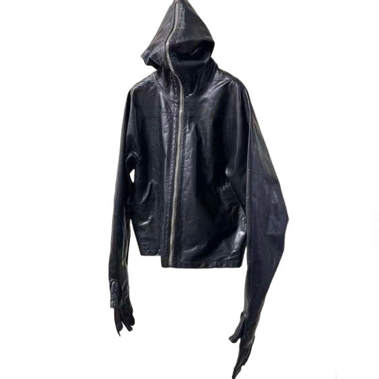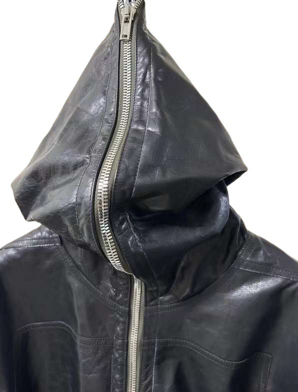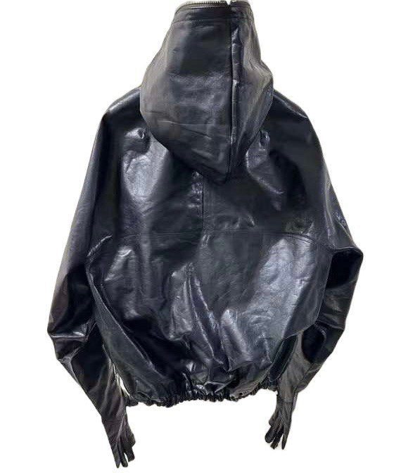 Black Leather hooded jacket with gloves from Rick Owens brand on the zip.