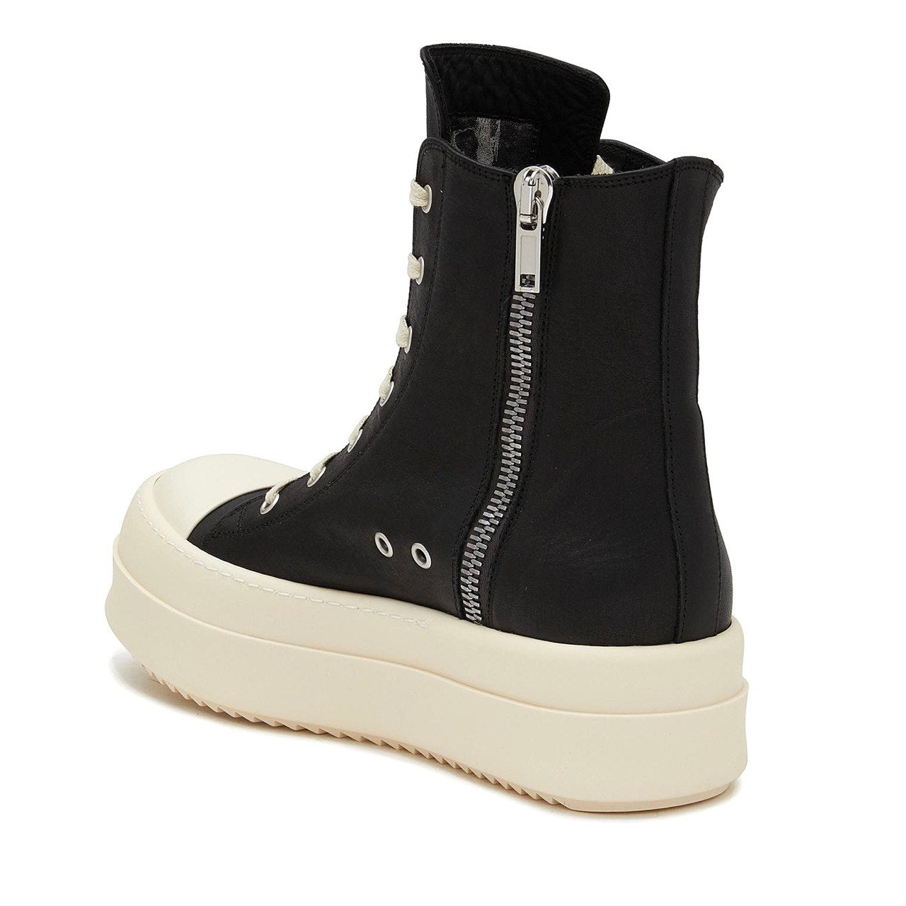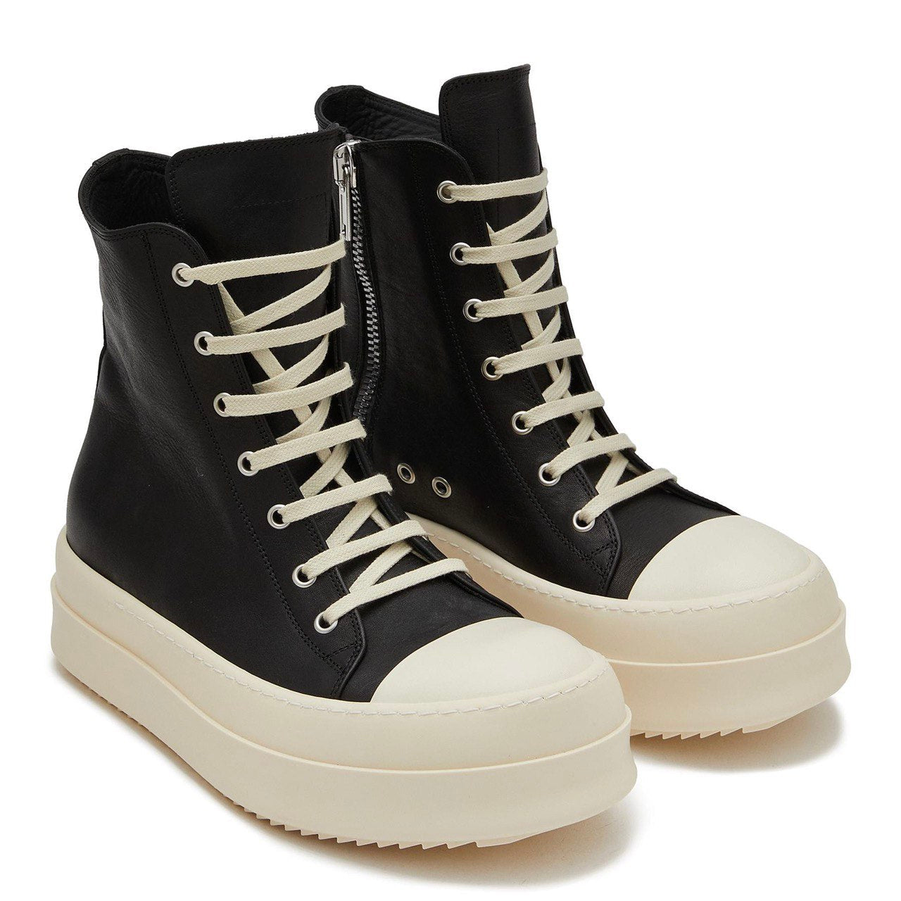 Experience unmatched style and comfort with our RICK OWENS Mega Bumper Sneakers in Black Leather. These sneakers feature an inside zip fastening, front lacing, and a notched platform sole for a sleek and modern look. The high-quality black leather adds durability and sophistication to any outfit. Elevate your shoe game with these trendy yet functional sneakers.