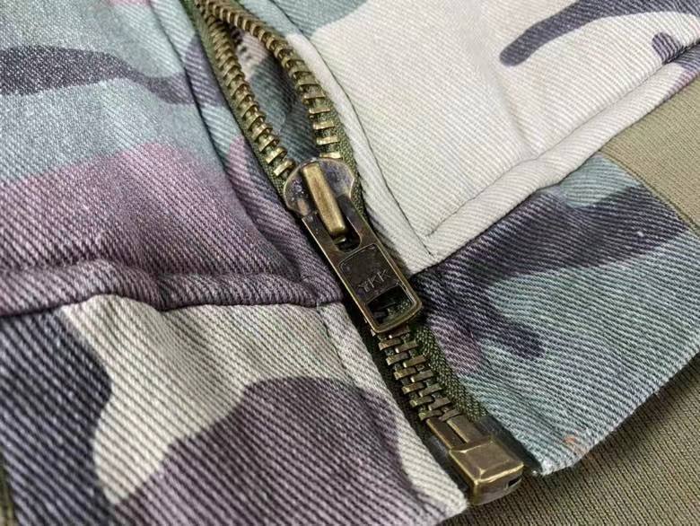 Oversized bomber jacket in custom vintage treated faded woodland camouflage. Hand screen printed denim patches on chest.