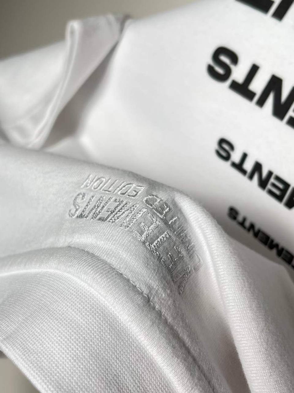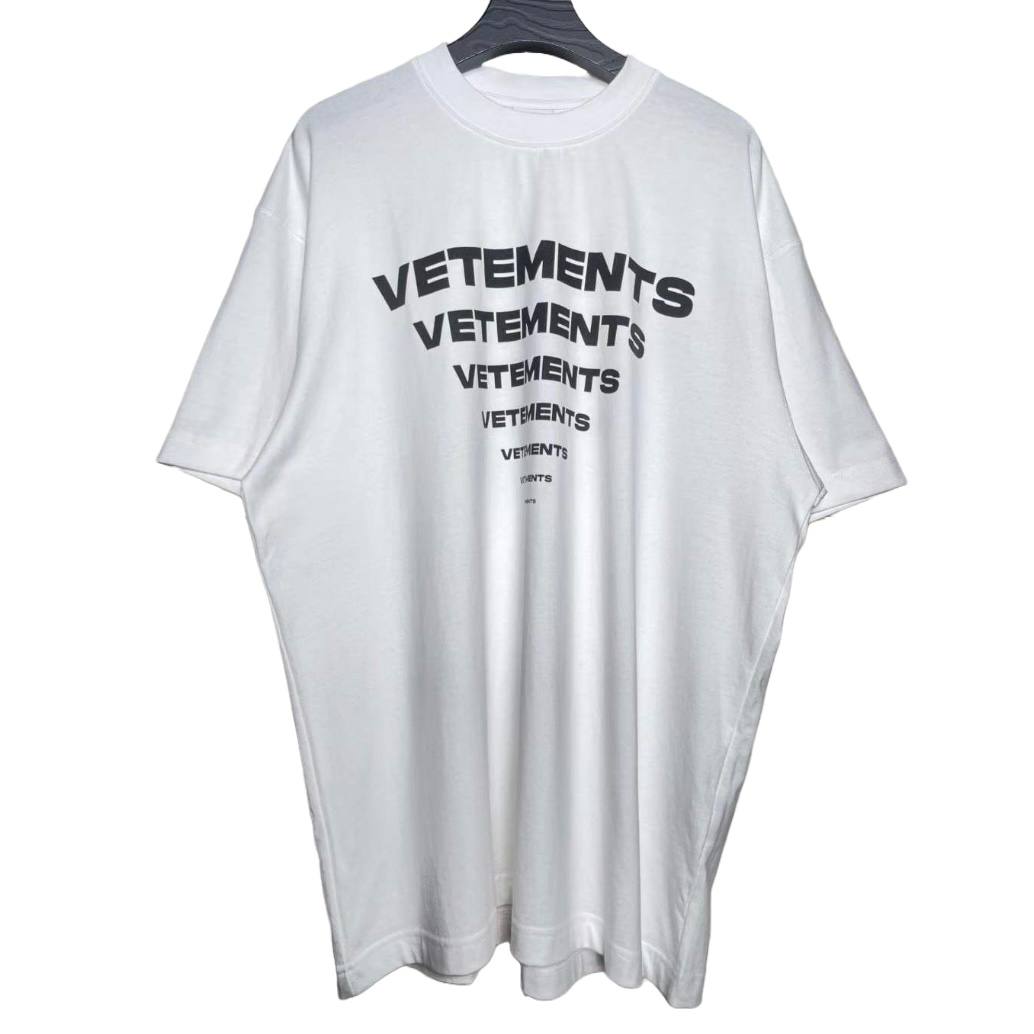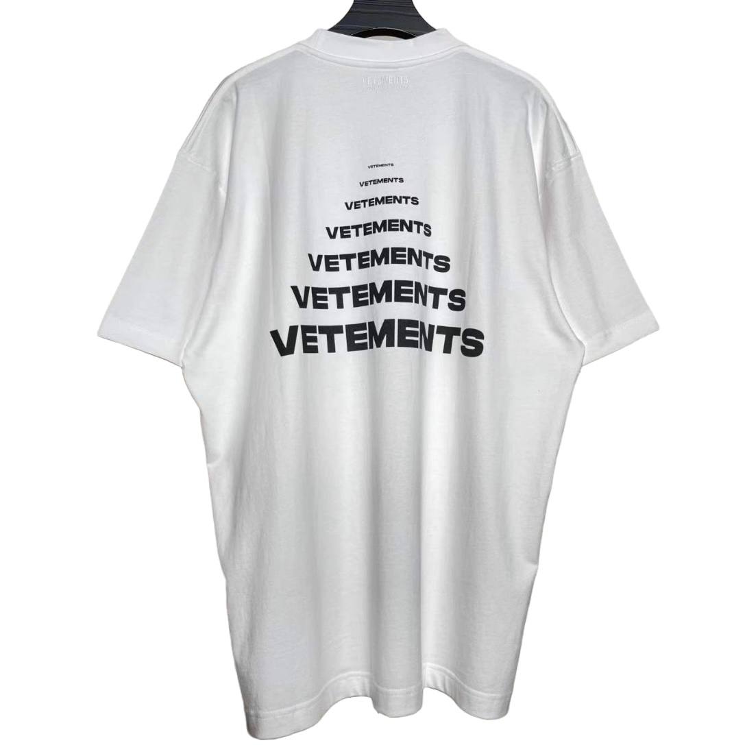 Expertly crafted from soft white cotton, this VETEMENTS T-shirt features a round neck, short sleeves, and an oversized fit for all-day comfort. The statement logo print on the front and back adds a touch of style to this essential wardrobe piece. Perfect for effortlessly elevating any look.
